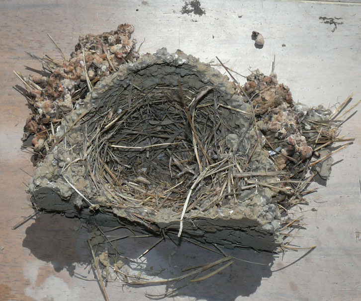 親ツバメとヒナ5羽の体重が各18gとしたら、全員で126gになります。巣そのものの重さを入れても500g程度でしょうから、4kgの重さに耐えられる巣は十分な強度を持っていると言えるでしょう。実際には、ツバメの巣はそれ自体が壊れるよりも壁から剥がれて落下する事故が多いのですが、ムチンの微少なブリッジ構造で接着するという性質を考えると、表面がなめらかな壁との接着強度は弱くなると考えられます。ツバメの巣は、珪藻土のような土の粒子が表面に出ている壁との接着力が最も強くなるはずです。