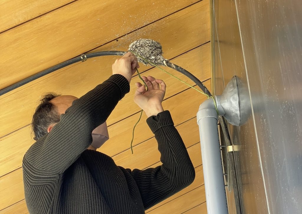 グラグラしていて、このままツバメが営巣してしまうと途中で巣が落ちてしまう可能性があるので、紐を使ったり 別の場所ではワイヤーを使ったりして 補修工事もしました。